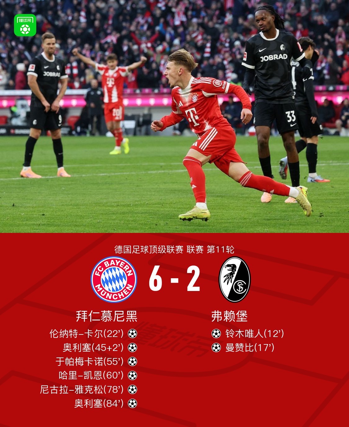 北京时间11月22日德国足球顶级联赛 联赛 第11轮,拜仁慕尼黑主场对阵弗赖堡。拜仁慕尼黑伦纳特-卡尔破门,奥利塞梅开二度,于帕梅卡诺破门,哈里-凯恩破门,尼古拉-雅克松破门。弗赖堡铃木唯人破门,曼赞比破门。最终比分拜仁 6–2 弗赖堡。