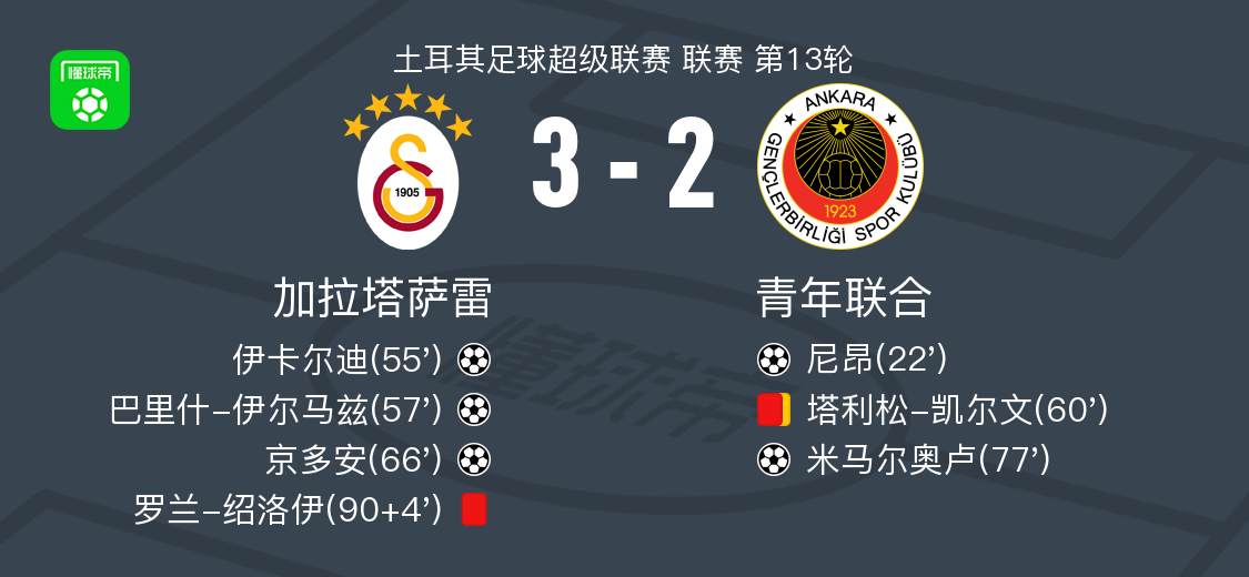 北京时间11月23日土耳其足球超级联赛 联赛 第13轮,加拉塔萨雷主场对阵青年联合。加拉塔萨雷伊卡尔迪破门,巴里什-伊尔马兹破门,京多安破门。青年联合尼昂破门,米马尔奥卢破门。最终比分加拉塔萨雷 32 青年联合。