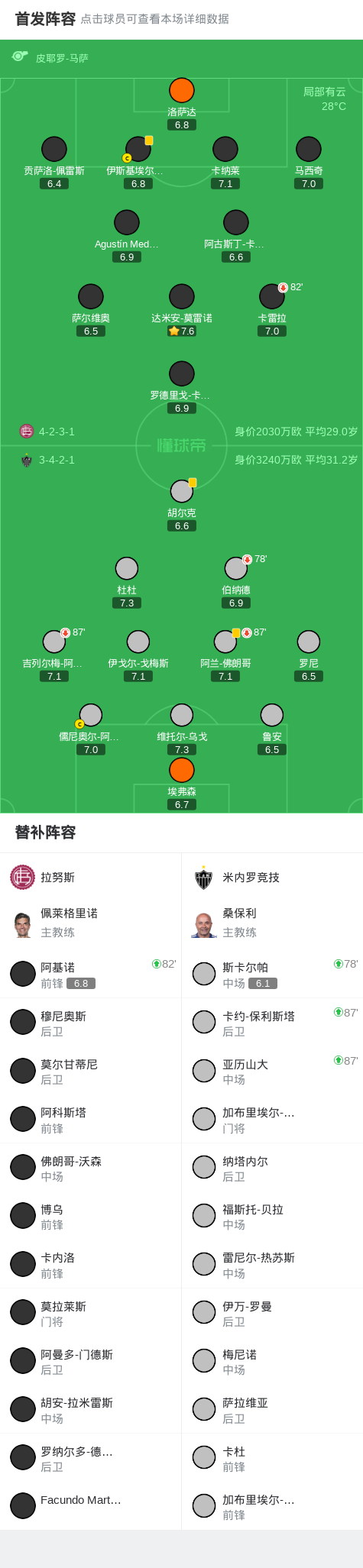 北京时间11月23日南美洲球会杯 决赛,拉努斯对阵米内罗竞技。最终比分拉努斯 0–0 米内罗竞技。 点击查看本场比赛详细数据>> 点击查看南球杯完整积分榜>> 球队阵容 技术统计 文章导航 孔蒂再遭打击,佩杜拉:霍伊伦因右大腿股二头肌受伤而下场 维尔贝克:没去想世界杯,我一直保持顺其自然的心态