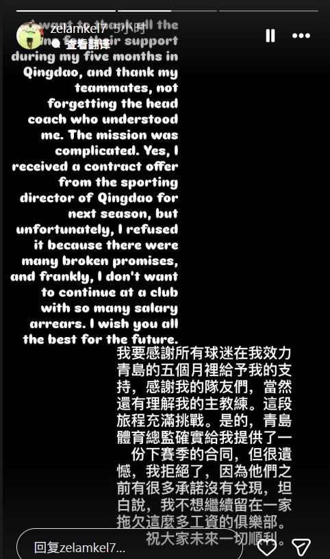 兰克尔-泽在社媒表示:“我要感谢所有球迷在我效力青岛的五个月里给予我的支持,感谢我的队友们,当然还有理解我的主教练。这段旅程充满挑战。是的,青岛体育总监给我提供了一份下赛季的合同,但很遗憾,我拒绝了。因为他们之前有很多承诺没有兑现,坦白说,我不想继续留在一家拖欠这么多工资的俱乐部。祝大家一切顺利。”