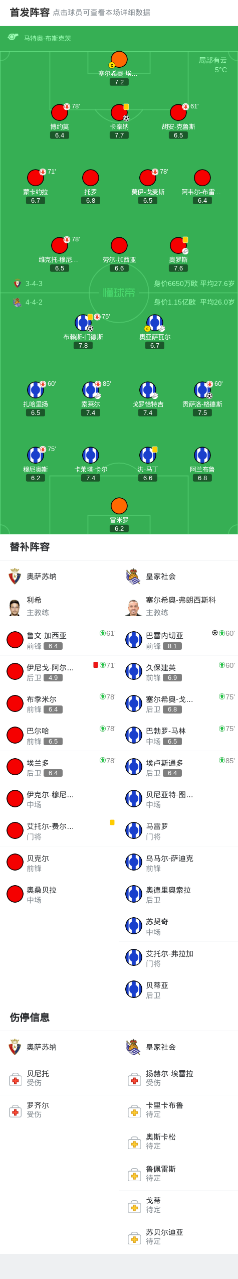 北京时间11月23日西班牙足球甲级联赛 联赛 第13轮,奥萨苏纳主场对阵皇家社会。奥萨苏纳卡泰纳破门。皇家社会布赖斯-门德斯破门,贡萨洛-格德斯破门,巴雷内切亚破门。最终比分奥萨苏纳 13 皇家社会。