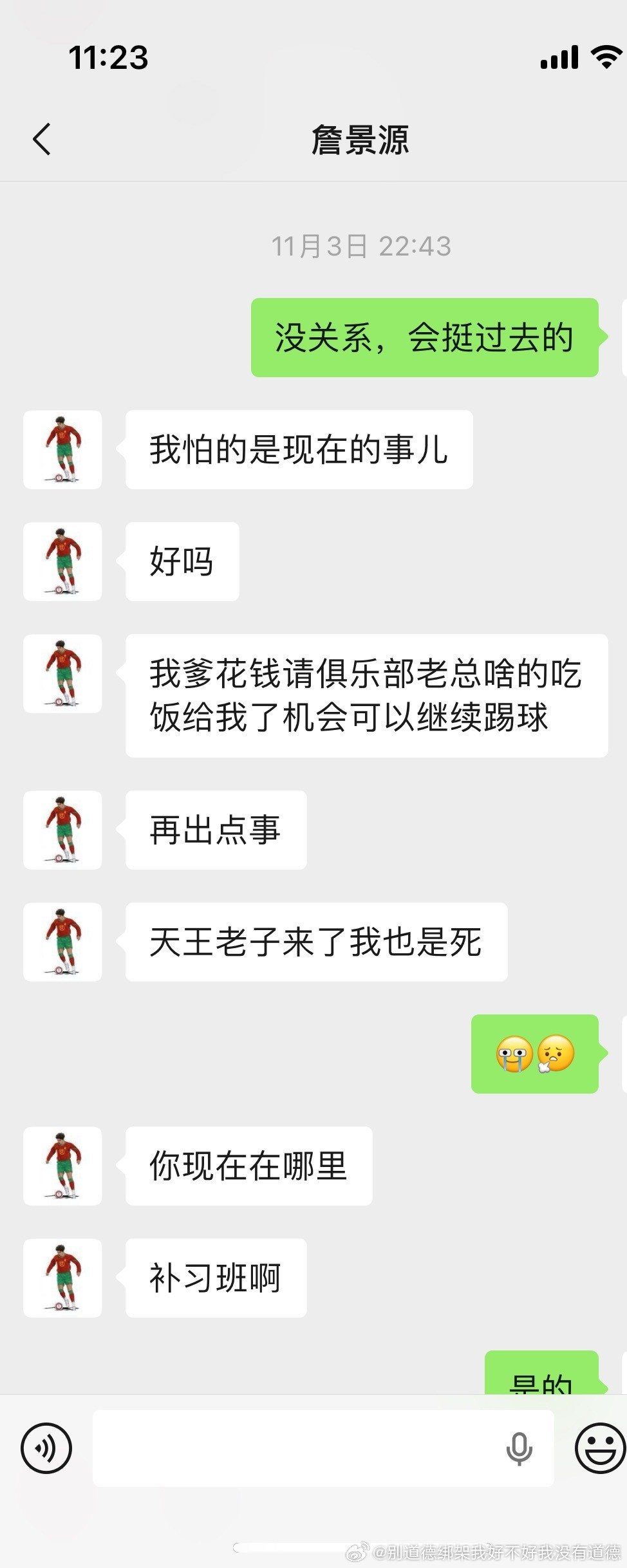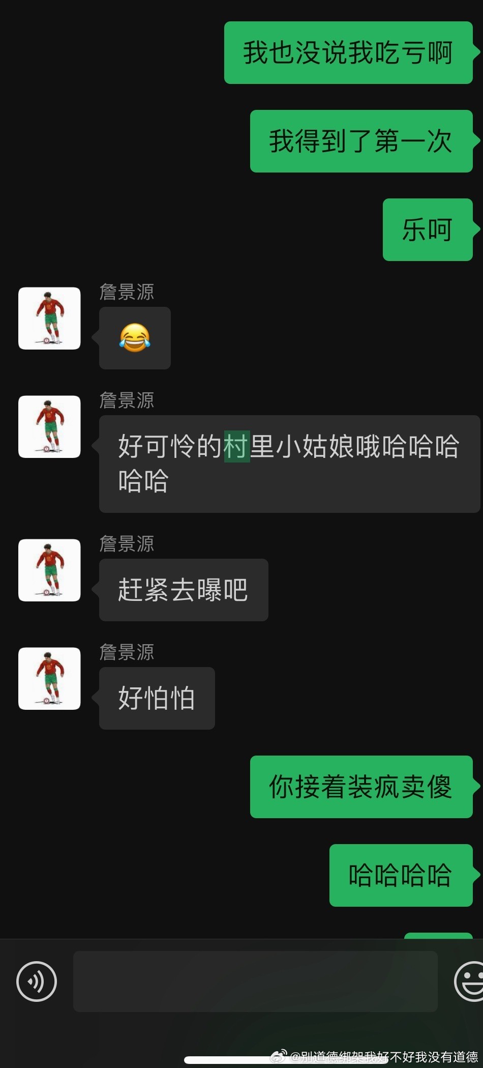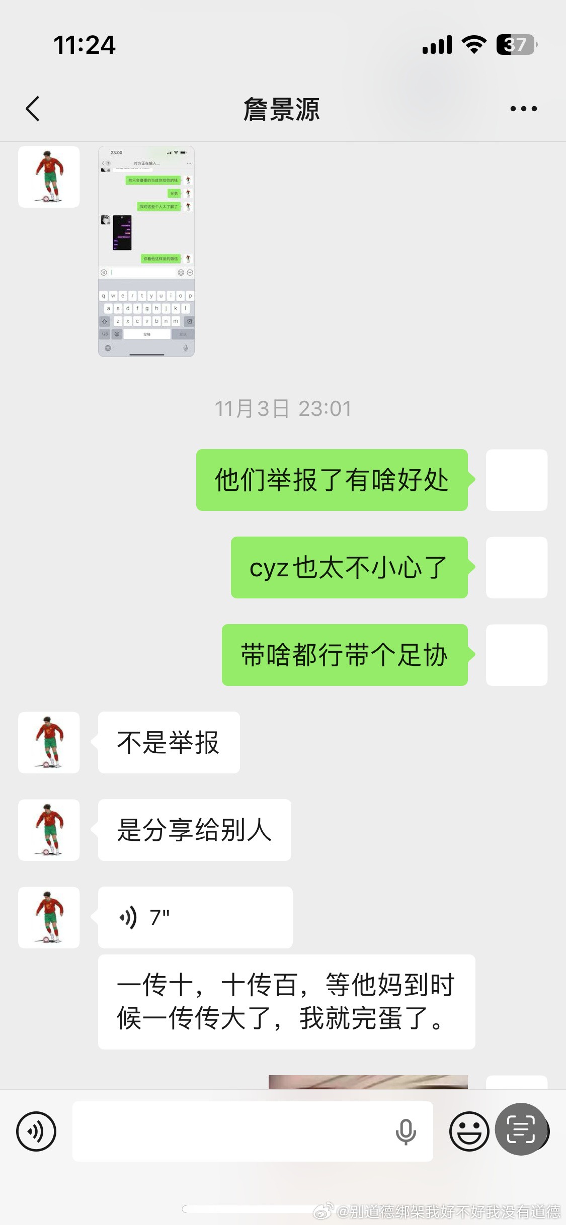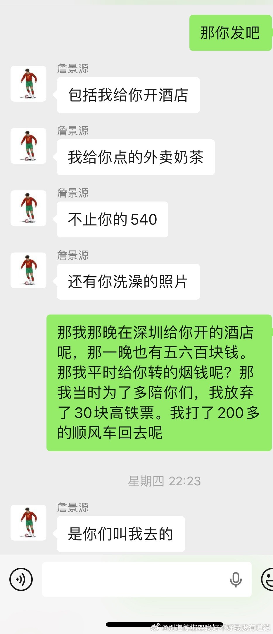 用户“别道德绑架我好不好我没有道德”还晒出一张詹景源照片及多张聊天记录截图,通过截图可以看到,疑似詹景源承认与未成年人、空姐发生性关系,家里向俱乐部塞钱获取踢球机会等。