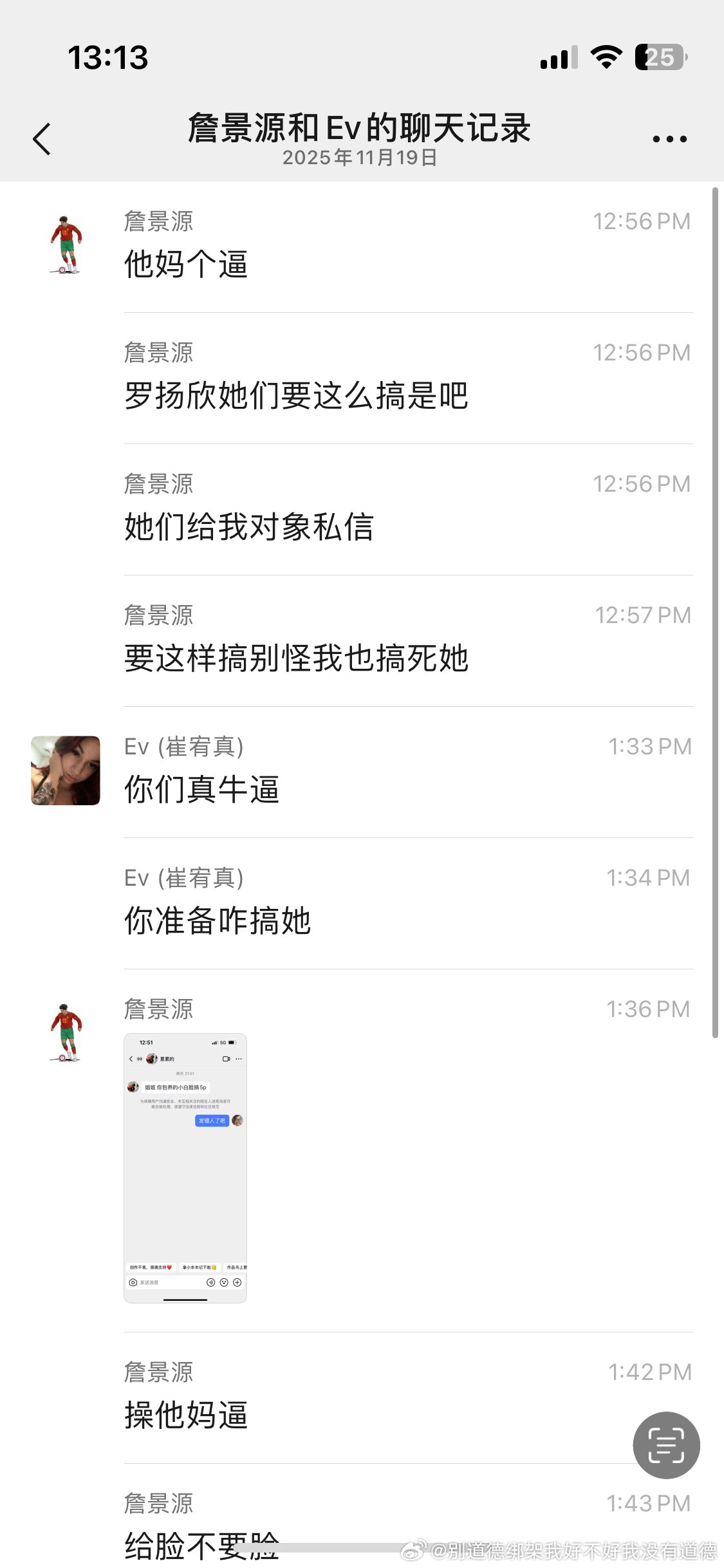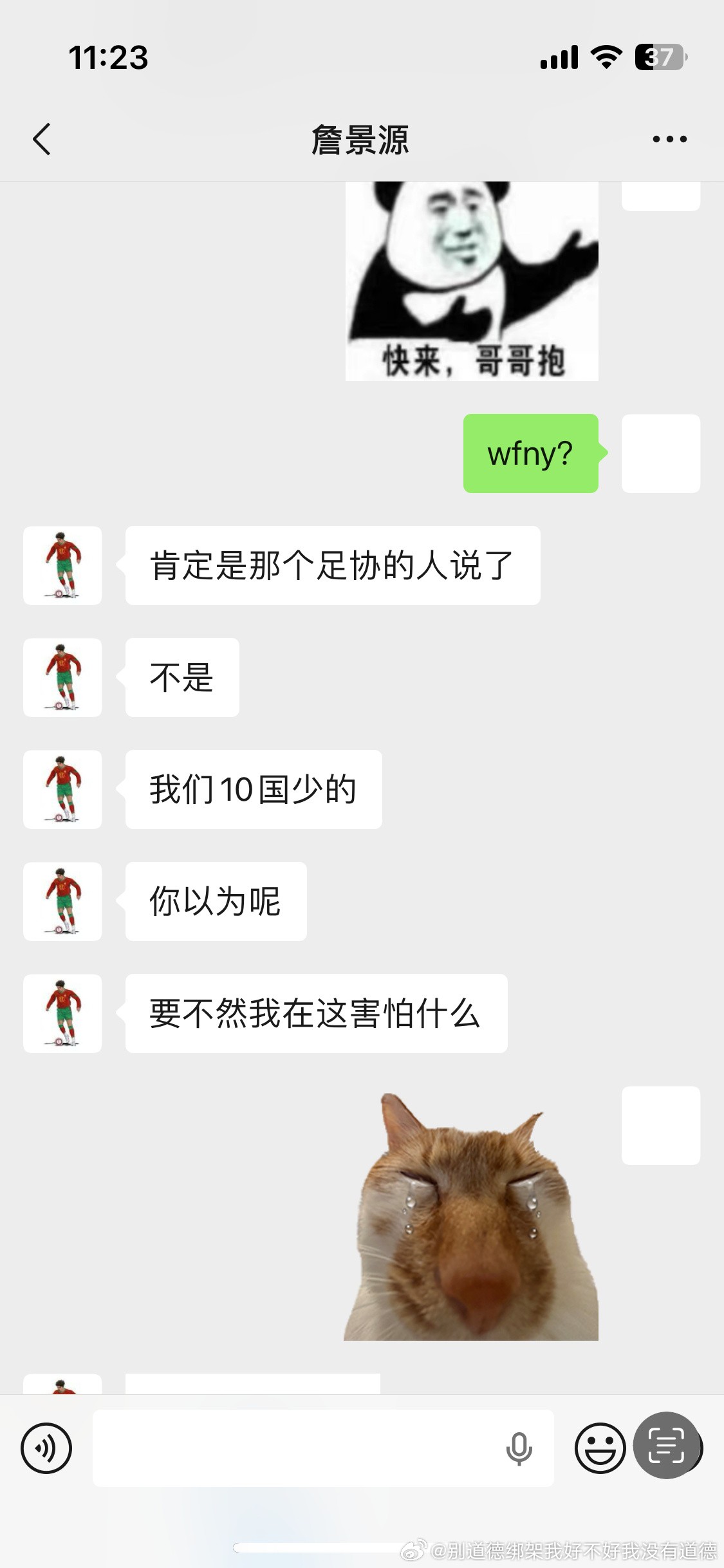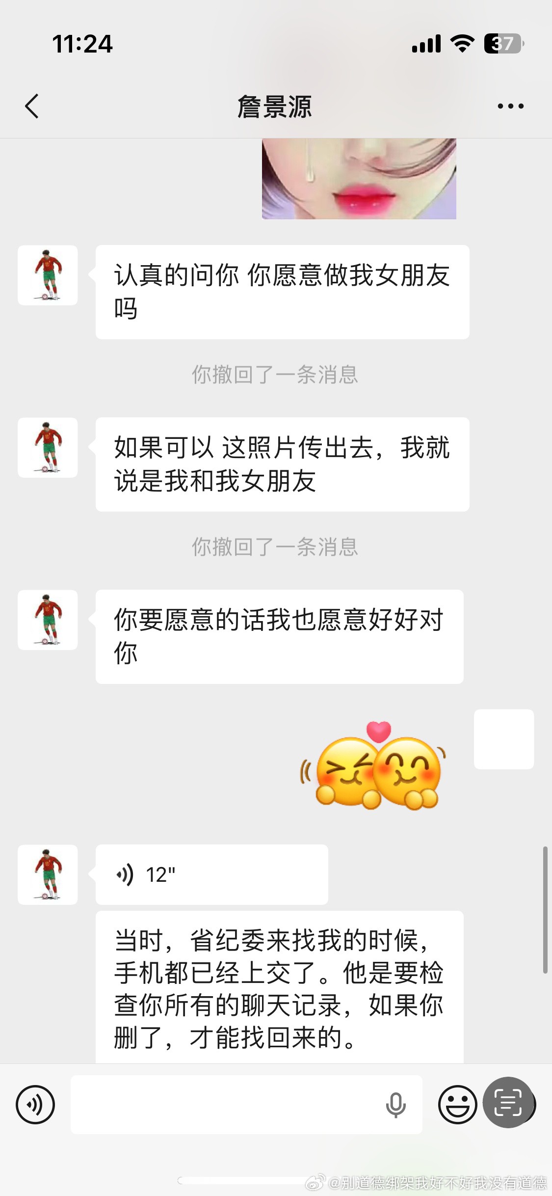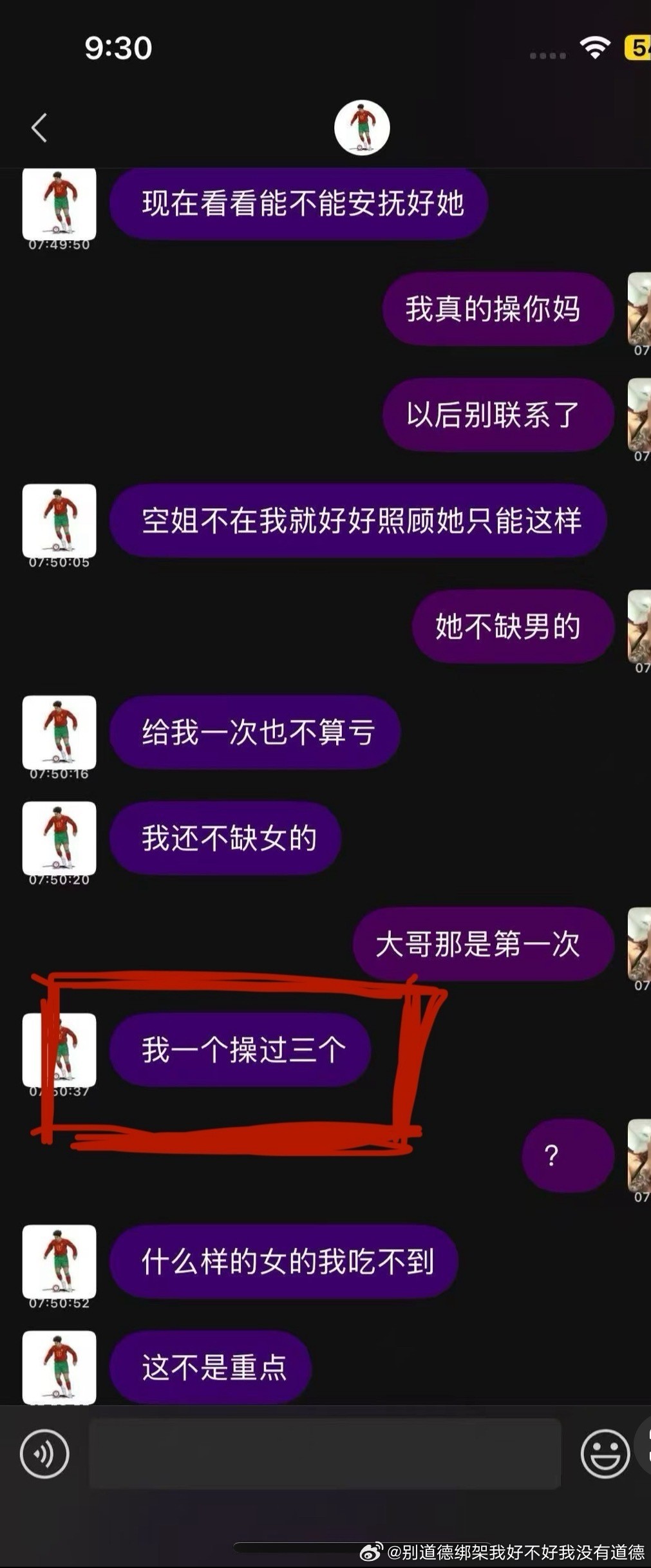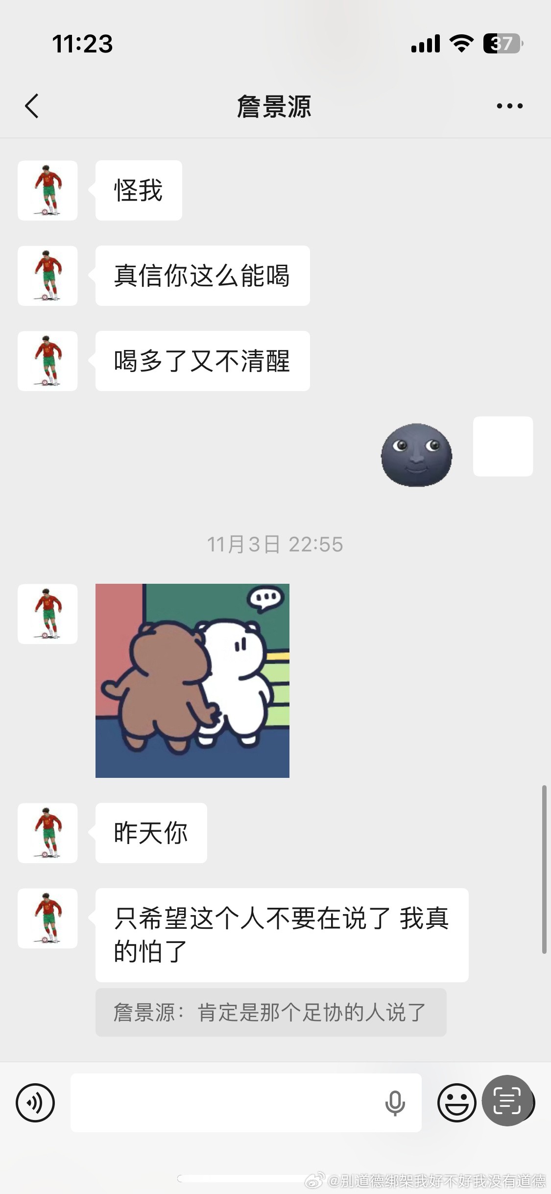 用户“别道德绑架我好不好我没有道德”还晒出一张詹景源照片及多张聊天记录截图,通过截图可以看到,疑似詹景源承认与未成年人、空姐发生性关系,家里向俱乐部塞钱获取踢球机会等。