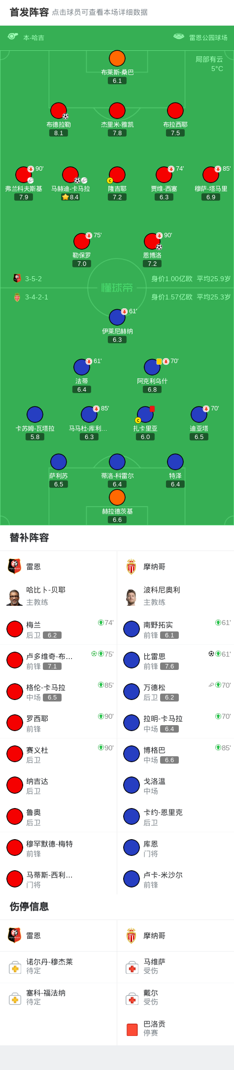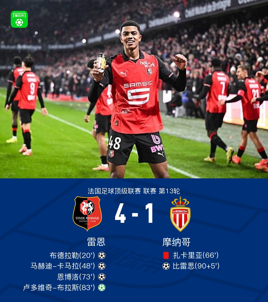 北京时间11月23日,法国足球甲级联赛第13轮,雷恩主场迎战摩纳哥。比赛中,雷恩率先打破僵局,布德拉勒接马赫迪-卡马拉的助攻取得进球。随后马赫迪-卡马拉再下一城,为球队扩大领先优势。比赛进入下半场,摩纳哥球员扎卡里亚被红牌罚下,令球队陷入人数劣势。此后雷恩持续施压,恩博洛在弗兰科夫斯基的助攻下破门得分。卢多维奇-布拉斯随后主罚点球命中,进一步巩固比分。临近结束,摩纳哥由万德松助攻比雷思扳回一球。最终全场比赛结束,雷恩以4比1战胜摩纳哥。