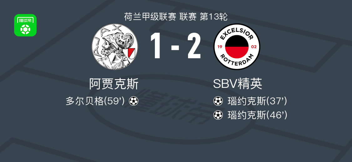 北京时间11月23日,荷兰甲级联赛第13轮展开较量,阿贾克斯主场迎战SBV精英。比赛中,SBV精英率先打破僵局,迈森送出助攻,瑙约克斯推射破门。易边再战,瑙约克斯再度建功,完成个人梅开二度,帮助客队扩大领先优势。随后阿贾克斯由米卡-古茨送出精准传球,多尔贝格抓住机会扳回一城。最终全场比赛结束,阿贾克斯以1比2不敌SBV精英。