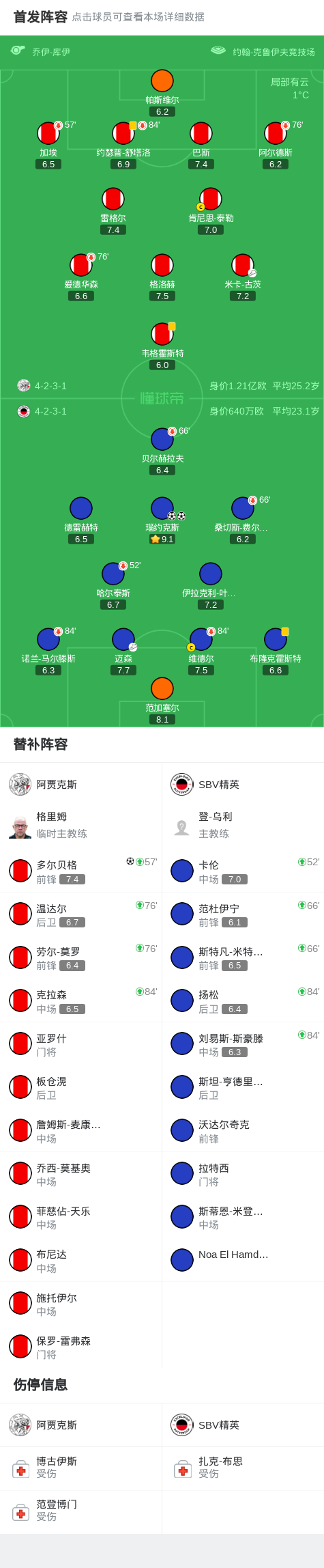 第59分钟,阿贾克斯球员米卡-古茨助攻多尔贝格打入一球。
