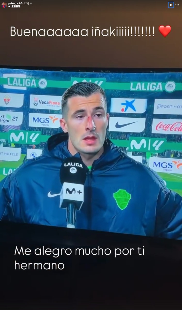 赛后,加维更新社交媒体,晒出了佩尼亚接受采访的画面,并写道:“太棒了,伊尼亚基!!!!!!!❤️