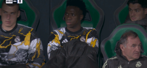 第7分钟,镜头给到场边,维尼修斯替补席待命