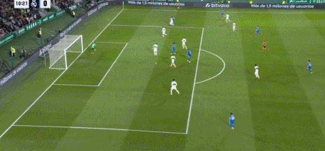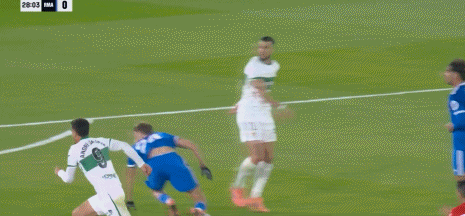 第29分钟,安德烈-席尔瓦一对一面对库尔图瓦,没有射门选择横传被破坏