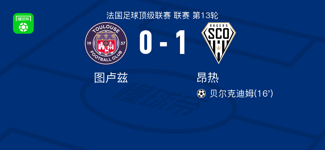 北京时间11月24日,法国足球甲级联赛第13轮,图卢兹主场迎战昂热。比赛中,昂热球员贝尔克迪姆攻入全场唯一进球,帮助球队取得领先。最终,图卢兹0-1不敌昂热。
