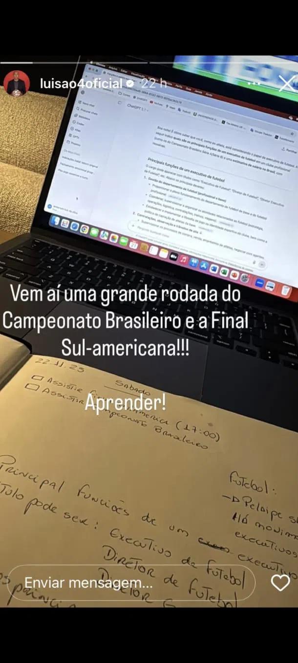 ChatGPT对他的提问做出了回答,并以“晚上好,很高兴知道您作为前运动员正在考虑担任足球总监的角色,接下来我会指出在一家职业俱乐部(例如巴甲/巴乙俱乐部)中一名足球总监的主要职责,以及在巴西的一份薪资估算,并附上一些说明”作为开头,而路易松随后将其中提供的所有信息逐一记录下来。
