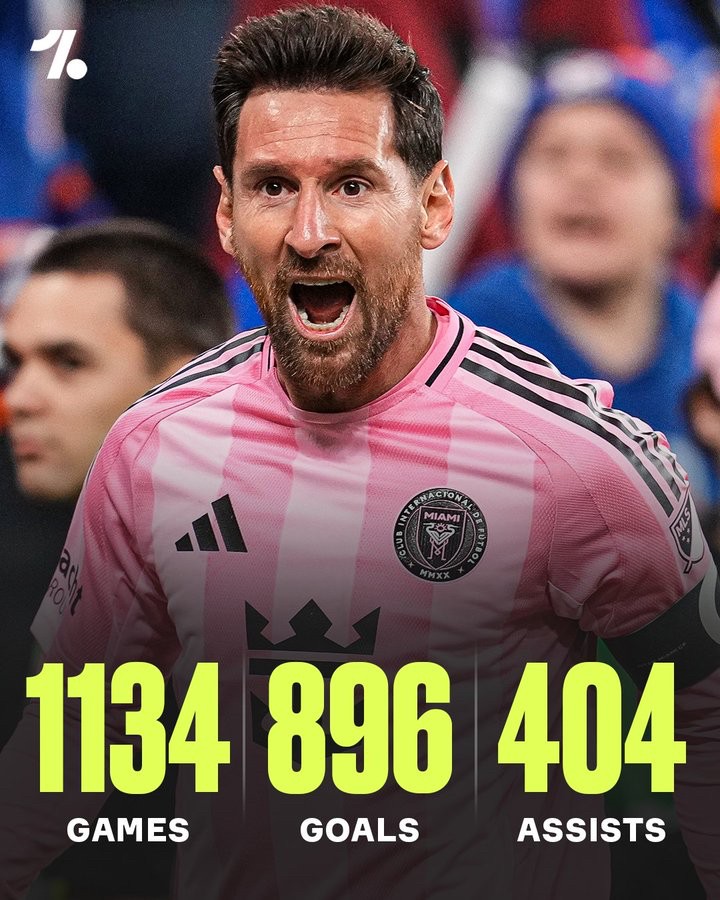 梅西在其职业生涯中达成了直接参与1300粒进球里程碑,在1134场比赛中共打进896球并送出404次助攻。
