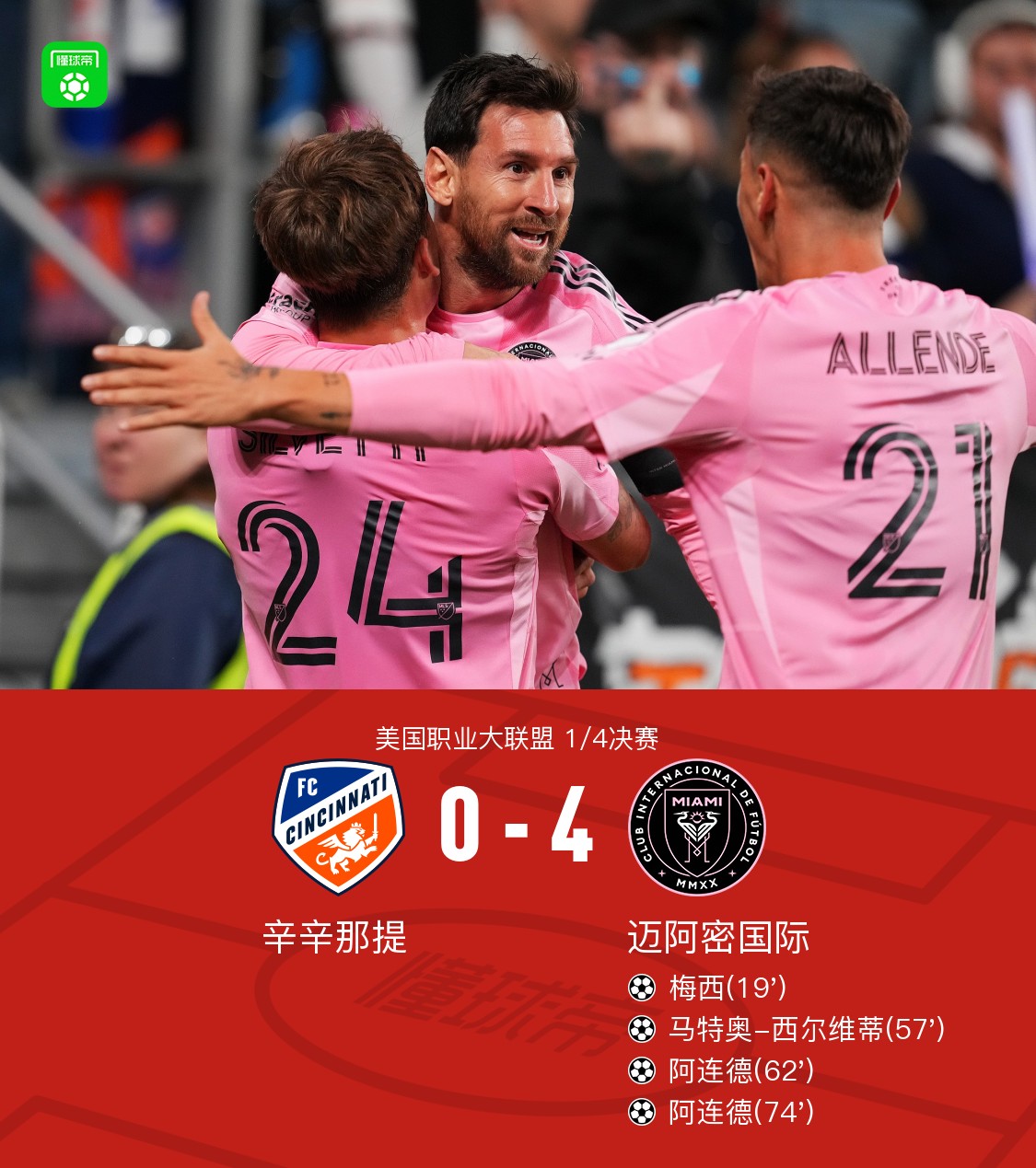 北京时间11月24日,美国职业大联盟季后赛1/4决赛展开较量,辛辛那提坐镇主场迎战迈阿密国际。上半场,马特奥-西尔维蒂送出助攻,梅西头球完成破门,帮助球队取得领先。下半场,梅西助攻西尔维蒂破门将比分扩大。随后,梅西两次助攻阿连德破门完成双响。最终,迈阿密国际4-0战胜辛辛那提晋级四强。