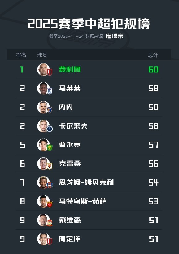 11月22日,2025赛季中超联赛落下战幕。根据懂球帝统计的2025赛季中超球员犯规榜:成都蓉城队费利佩以60次排在首位;大连英博队马莱莱、云南玉昆队内内、深圳新鹏城队卡尔采夫并列第二。