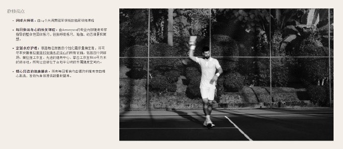 指导呼吸练习、冥想和瑜伽课程;网球专项训练和体能训练;结构化的拉伸和恢复护理;定制水疗体验;