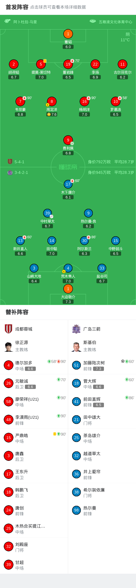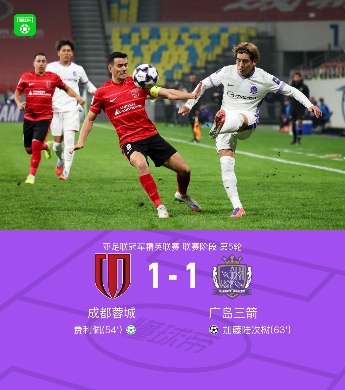 北京时间11月25日亚足联冠军精英联赛 联赛阶段 第5轮,成都蓉城对阵广岛三箭。成都蓉城费利佩破门。广岛三箭加藤陆次树破门。最终比分成都蓉城 11 广岛三箭。