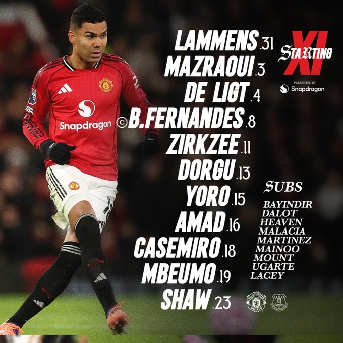 北京时间11月25日凌晨4点,英超联赛第12轮展开一场焦点战役,曼联对阵埃弗顿。赛前,双方公布首发阵容。