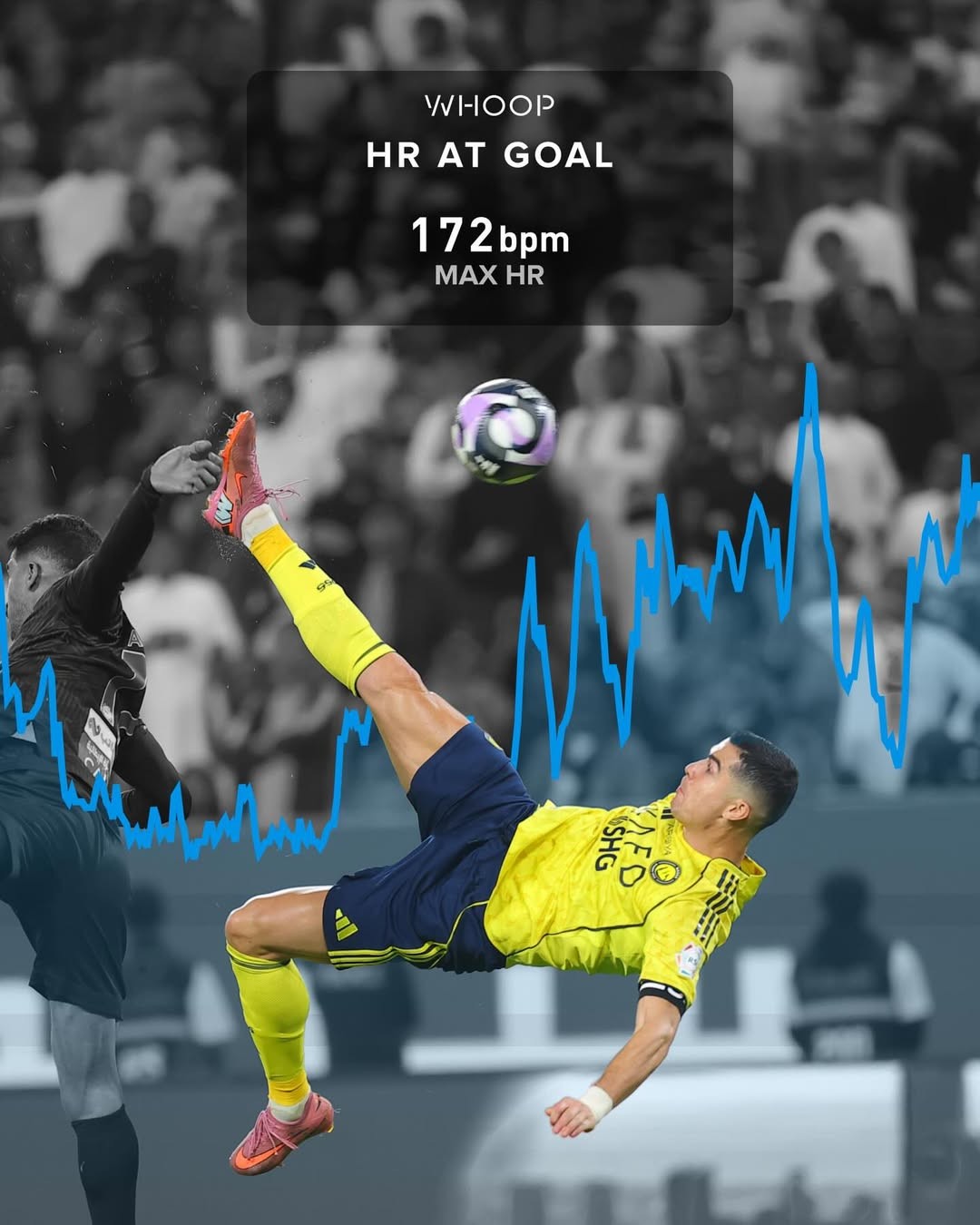 据制作可穿戴检测设备的whoop公司消息,C罗在此前沙特联赛中完成精彩倒钩时的心率高达172bpm。