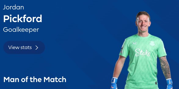 本场比赛埃弗顿门将皮克福德完成了6次扑救,力保球门不失。