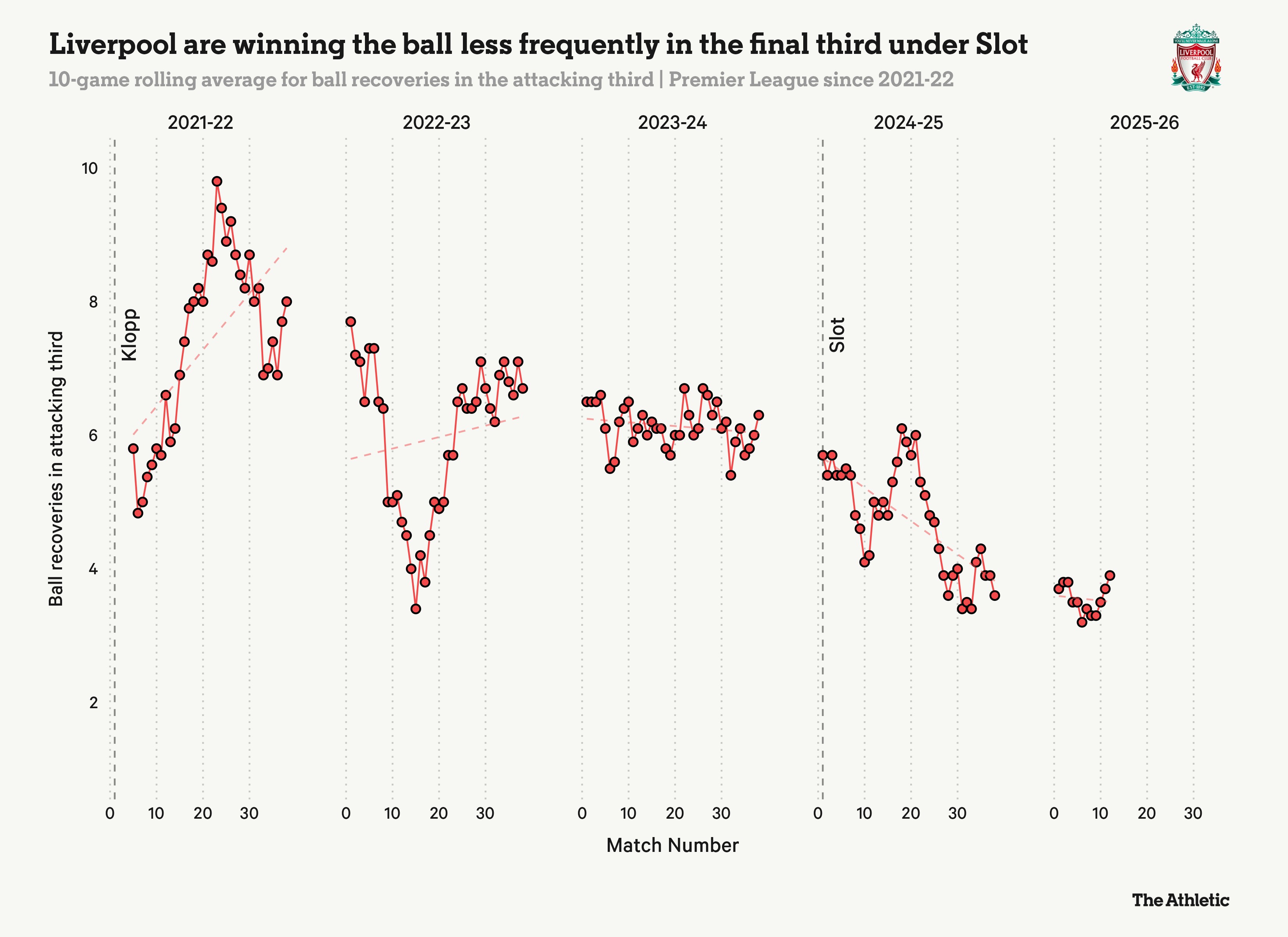 利物浦,由于锋线区域的变动,可以理解的是,本赛季的压迫没有上赛季那么成功。对手的战术布置也影响了这一点,球队在进攻三区夺回球权的滚动10场平均值在斯洛特麾下显著降低。