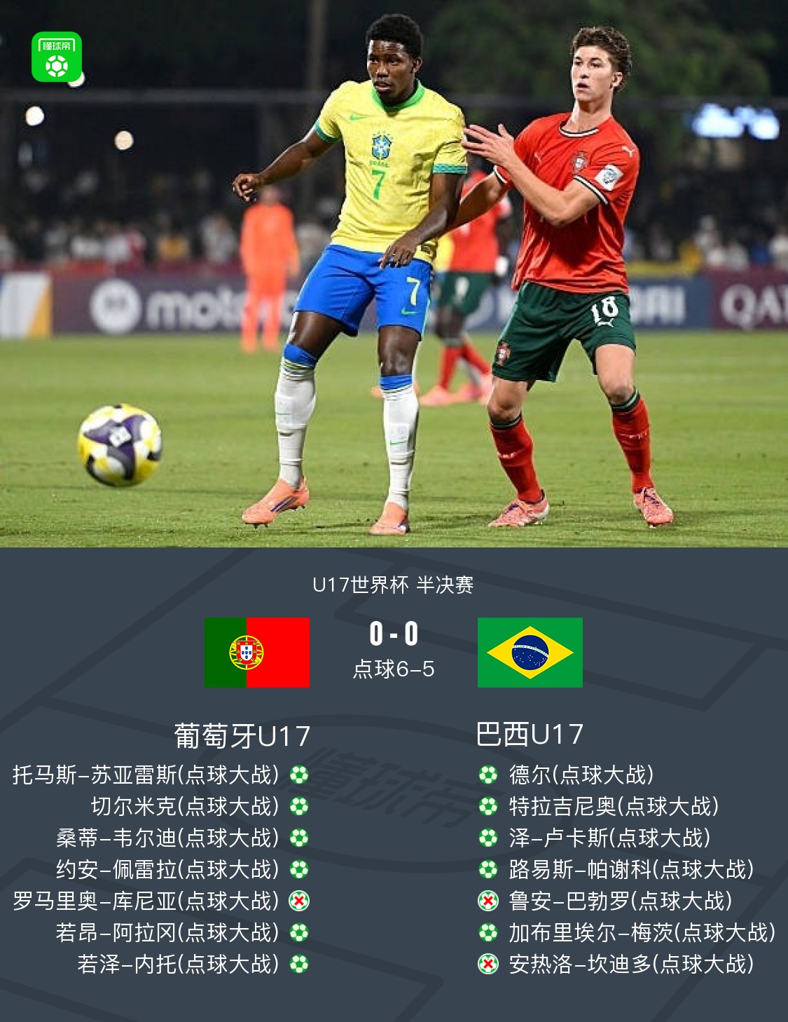 北京时间11月25日U17世界杯 半决赛,葡萄牙U17对阵巴西U17。双方90分钟互交白卷,点球大战U17葡萄牙6-5战胜巴西U17晋级决赛,坎迪多踢飞生死点球。