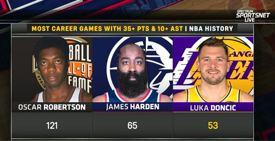 本场比赛,湖人队球星东契奇28投14中砍下43分9篮板13助攻1抢断1盖帽,三分球12中7,罚球11中8。这是他职业生涯第53次砍下单场至少35分10助攻的数据,排在历史第三位。在他身前的正式本场比赛的对手詹姆斯-哈登,后者以65次排名历史第二。排在第一的是奥斯卡-罗伯特森,他以121次排名历史第一。