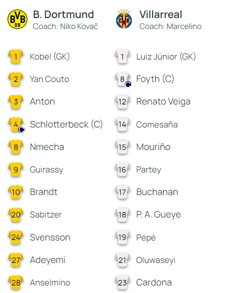 北京时间11月26日4:00,欧冠联赛阶段第5轮,多特蒙德坐镇西格纳-伊杜纳公园球场迎战比利亚雷亚尔,本场主裁判为达维德-马萨,赛前双方首发出炉。 文章导航 迎来第15次对决,拜仁是阿森纳在欧冠交手次数最多的球队 曼城vs勒沃库森:马尔穆什搭档萨维尼奥,哈兰德替补待命