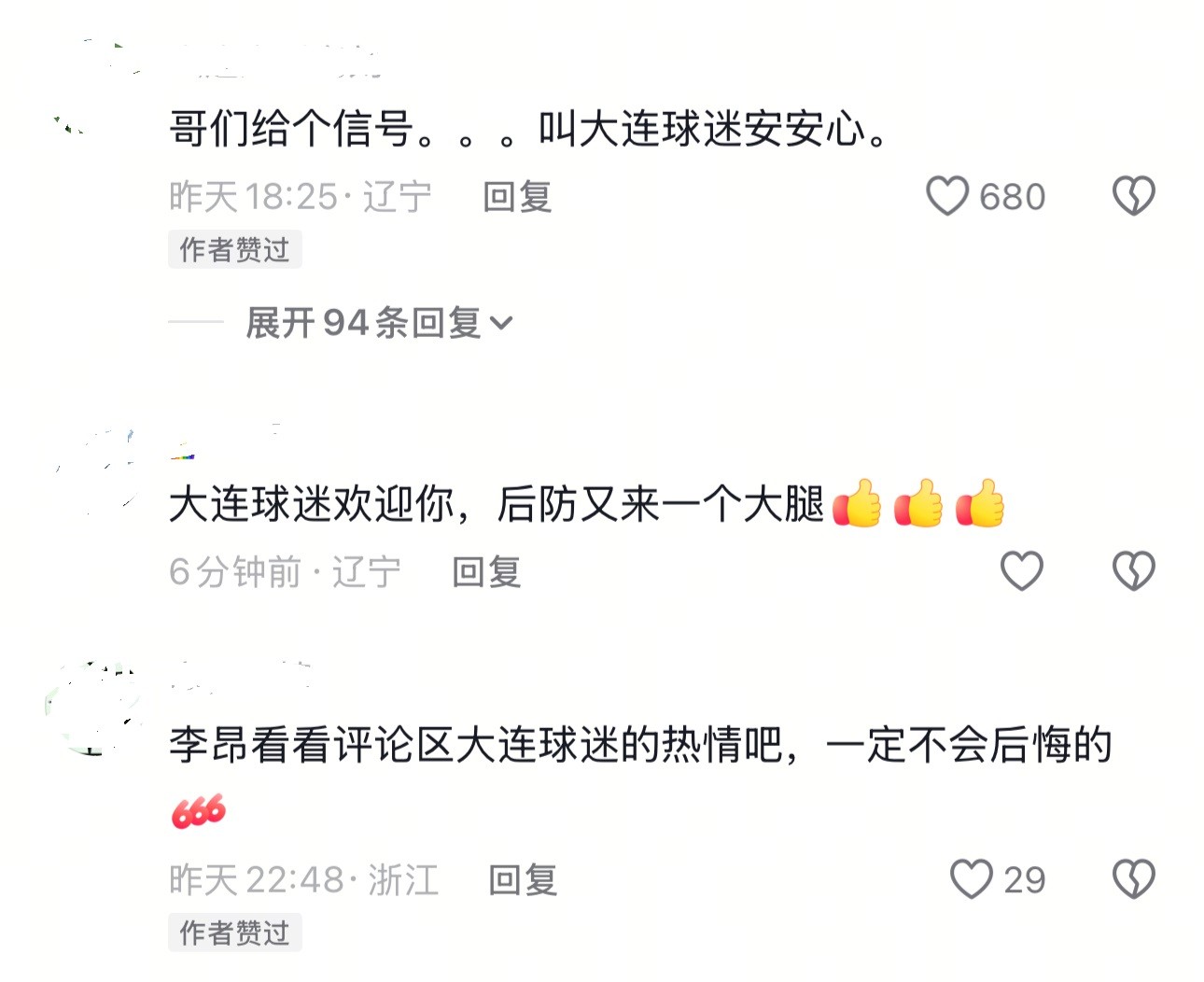 还有球迷留言:“李昂看看评论区大连球迷的热情吧,一定不会后悔的。”李昂也点赞了。