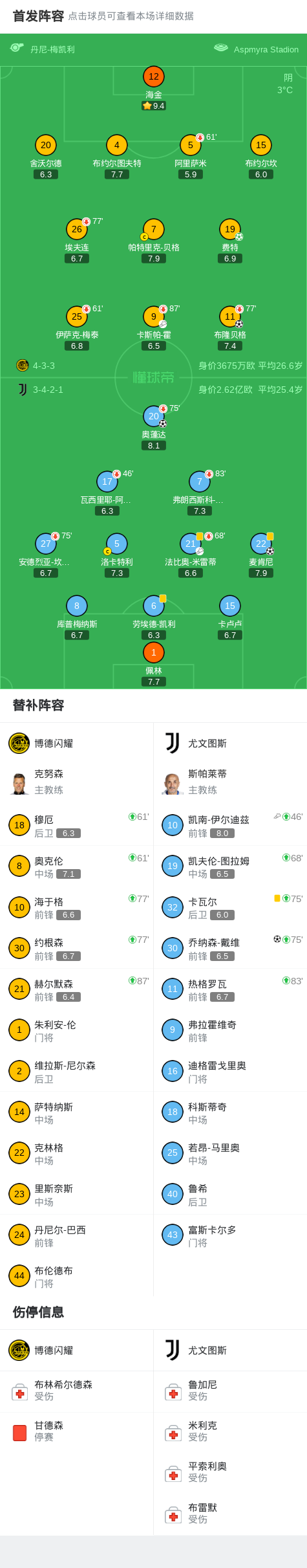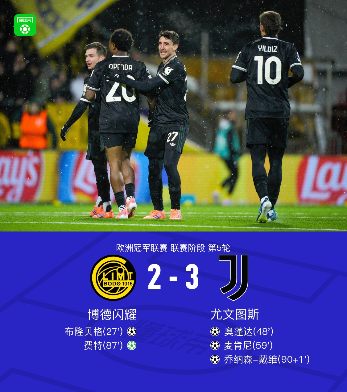 北京时间11月26日,欧洲冠军联赛联赛阶段第5轮展开较量,博德闪耀迎战尤文图斯。比赛开局阶段,卡斯帕-霍送出助攻,布隆贝格冷静破门,为博德闪耀先拔头筹。下半场易边再战,凯南-伊尔迪兹送出传球,奥蓬达接球后完成破门,帮助尤文图斯扳平比分。随后法比奥-米雷蒂送出精准助攻,麦肯尼抓住机会建功,尤文反超比分。比赛进入尾声,费特主罚点球命中,将比分再度拉近。补时阶段,乔纳森-戴维攻入关键一球,为尤文图斯锁定胜局。最终全场比赛结束,博德闪耀2-3不敌尤文图斯。