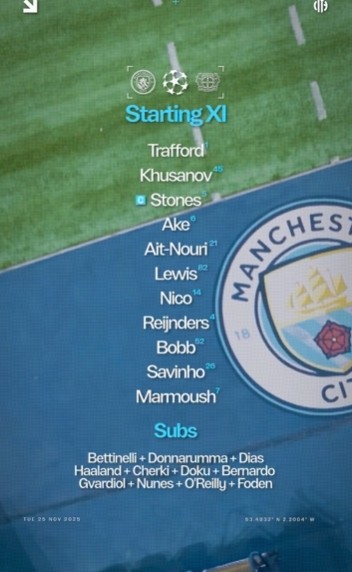 北京时间11月26日凌晨4点,欧冠联赛阶段第5轮展开一场焦点战役,曼城对阵勒沃库森。赛前,双方公布首发阵容。