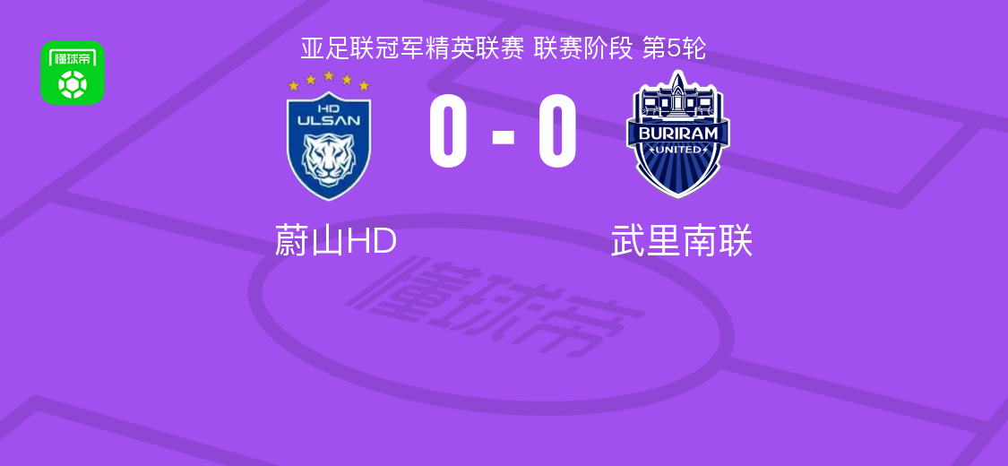 北京时间11月26日亚足联冠军精英联赛 联赛阶段 第5轮,蔚山HD对阵武里南联。最终比分蔚山HD 0–0 武里南联。