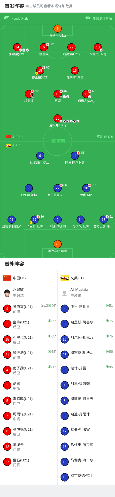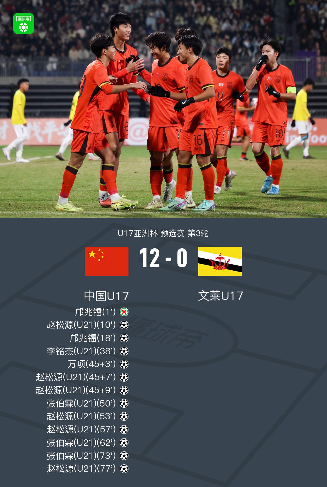 北京时间11月26日U17亚洲杯 预选赛 第3轮,中国U17对阵文莱U17。中国U17赵松源打入6球,邝兆镭破门,李铭杰破门,万项破门,张伯霖帽子戏法。最终比分中国U17 12–0 文莱U17。