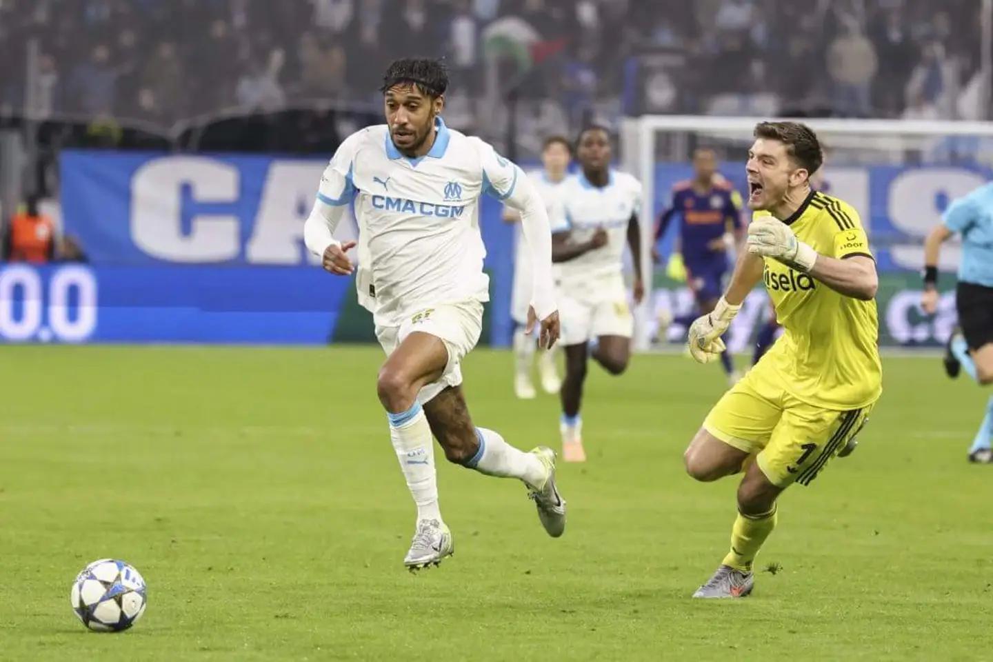 达里尔-巴科拉在中线附近吸引纽卡斯尔中场进行压迫,三名纽卡斯尔后卫——包括法比安-舍尔——跟随压上,而马利克-蒂奥则回撤很深。这位马赛中锋将球塞给插上的奥巴梅扬(这位前阿森纳前锋上半场已经浪费了四次机会),后者将佳夫吸引到左路外围。