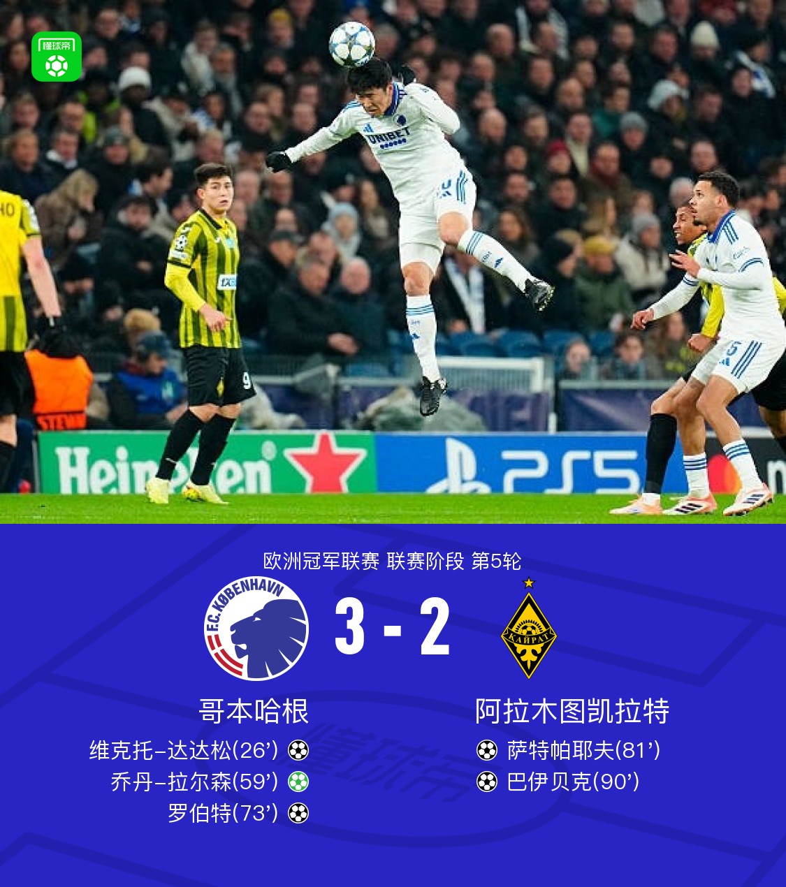 北京时间11月27日,欧洲冠军联赛联赛阶段第5轮,哥本哈根迎战阿拉木图凯拉特。比赛中,维克托-达达松率先为哥本哈根取得进球。随后乔丹-拉尔森通过点球破门,帮助球队扩大领先优势。罗伯特再入一球,进一步巩固比分。阿拉木图凯拉特并未放弃,萨特帕耶夫抓住机会扳回一分。比赛尾声阶段,扎里亚送出助攻,巴伊贝克破门,将比分追近。最终全场结束,比分为3-2,哥本哈根战胜阿拉木图凯拉特。