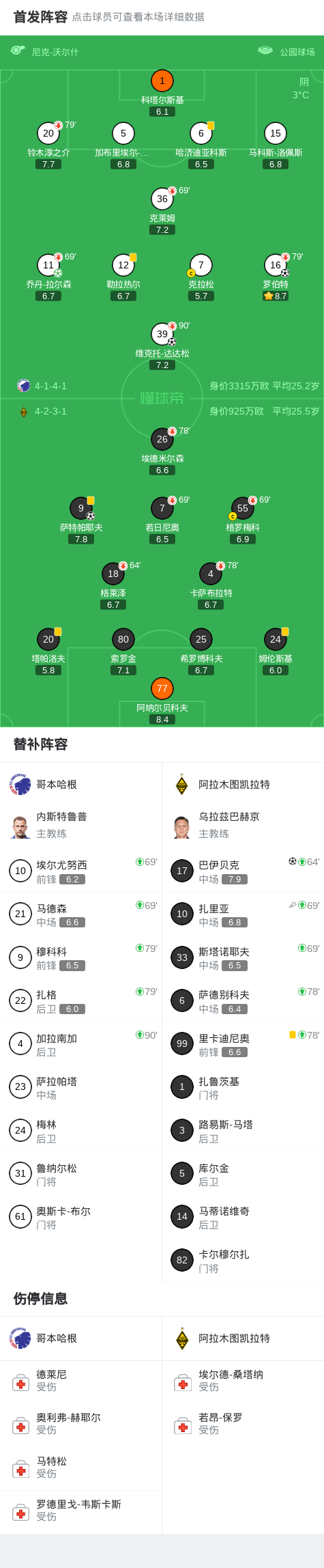 第59分钟,卡萨布拉特手球送点,乔丹-拉尔森点射命中,哥本哈根2-0