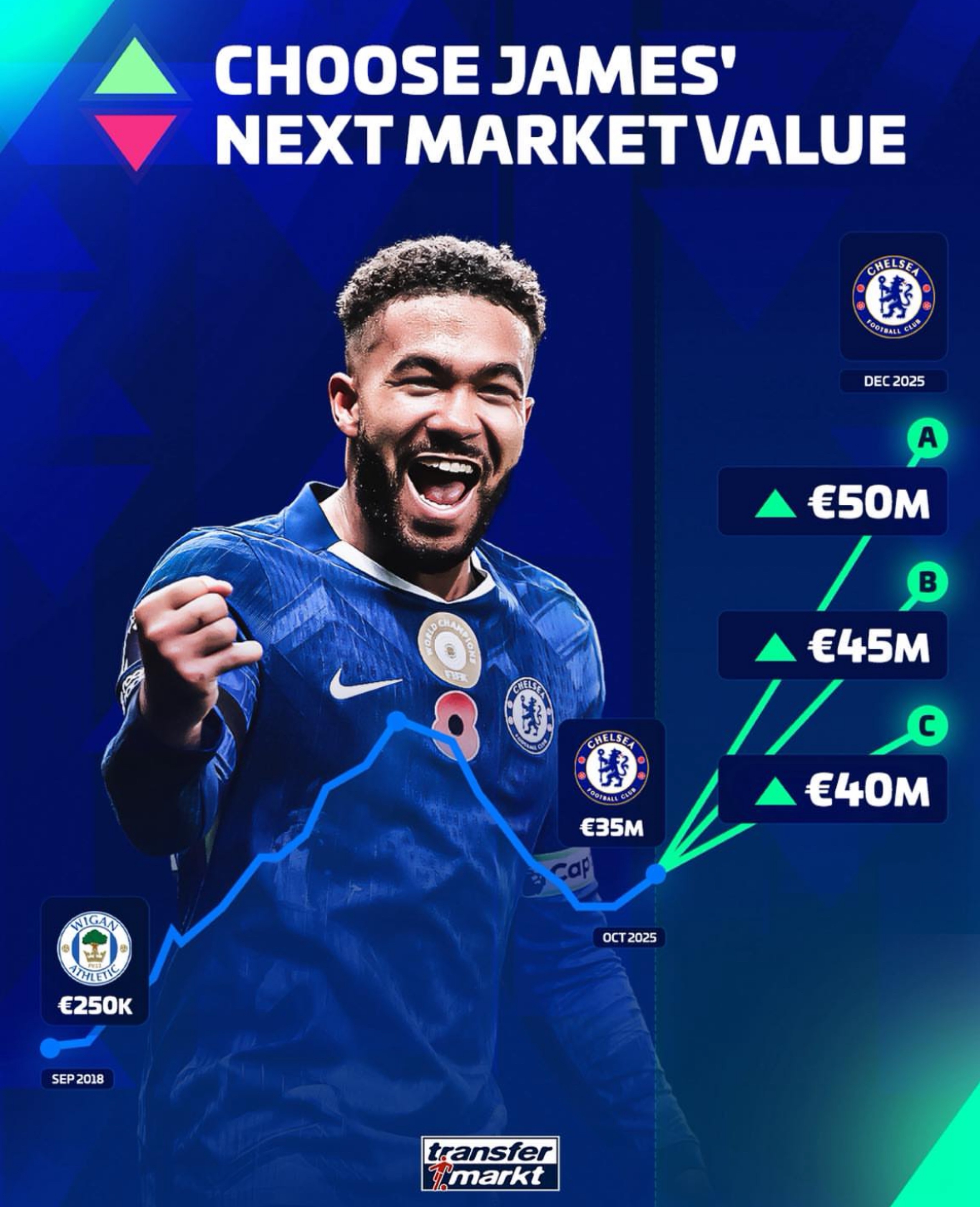 德转将在12月9日对英超球员的身价进行更新,今日德转预热切尔西后卫里斯-詹姆斯身价,最低涨至4000万欧,最高涨至5000万欧。