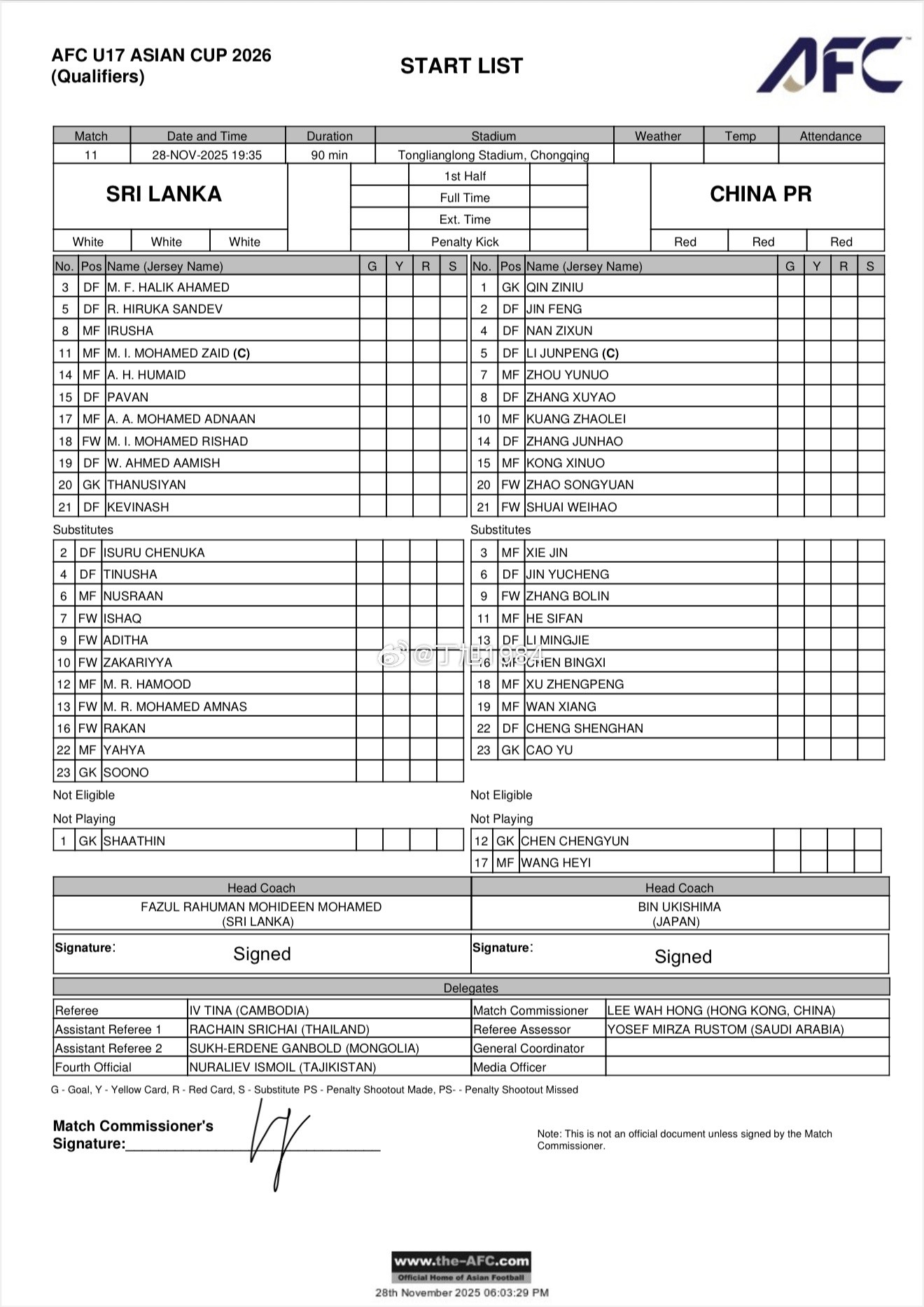 北京时间11月28日19:35,U17亚洲杯预选赛第四轮,中国U17对阵斯里兰卡U17,赛前双方公布首发: 文章导航 李璇:有个球队主帅最快明天官宣,下赛季应该能换个活法 太阳报:C罗准备在马德里开一家私人会所,会费最高13000英镑