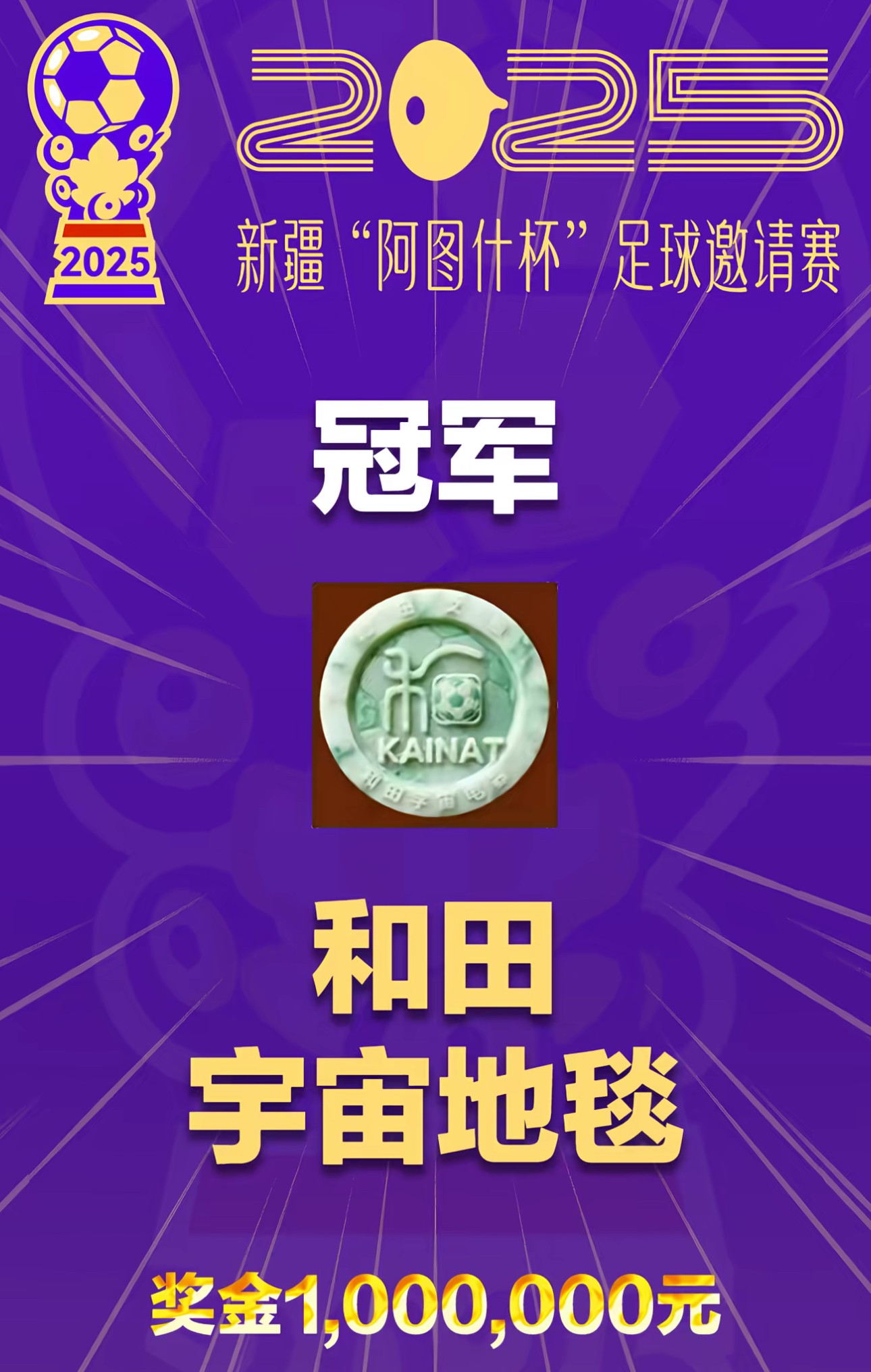 北京时间11月27日晚,2025年新疆“阿图什杯”足球邀请赛决赛在阿图什市足球公园打响,和田宇宙地毯队2-1战胜博州帕丽迪澳队,夺得冠军。据阿图什市融媒体中心报道,和田宇宙地毯队夺冠奖金是100万元,博州帕丽迪澳队亚军奖金为50万元。