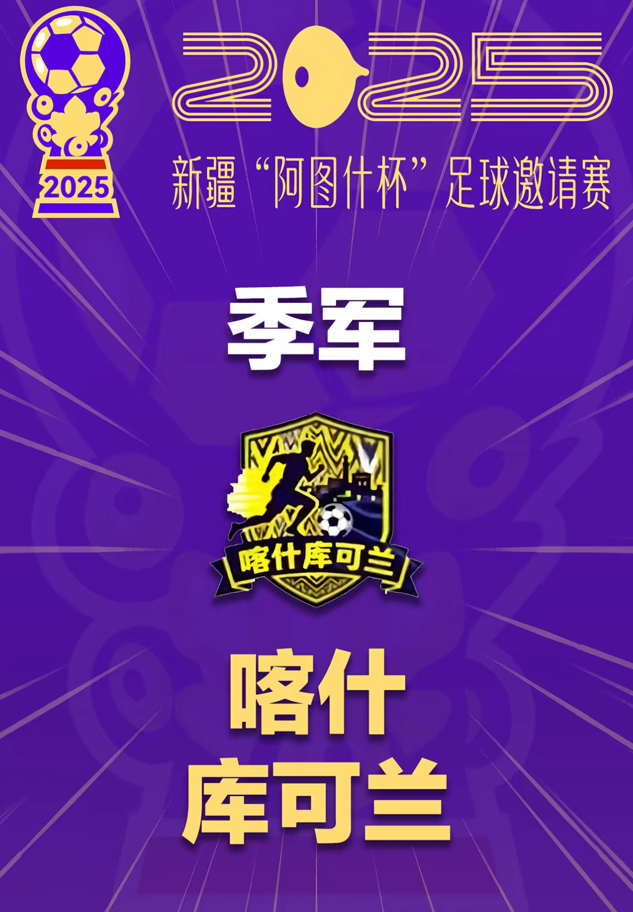 另外,在本届新疆“阿图什杯”季军争夺战里,喀什库可兰队1-0击败克州米拉瑟口腔队,喀什库可兰队获得季军。