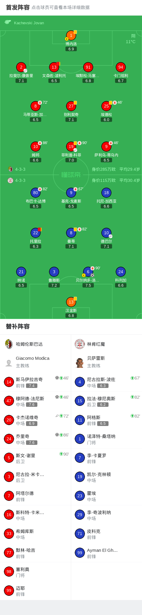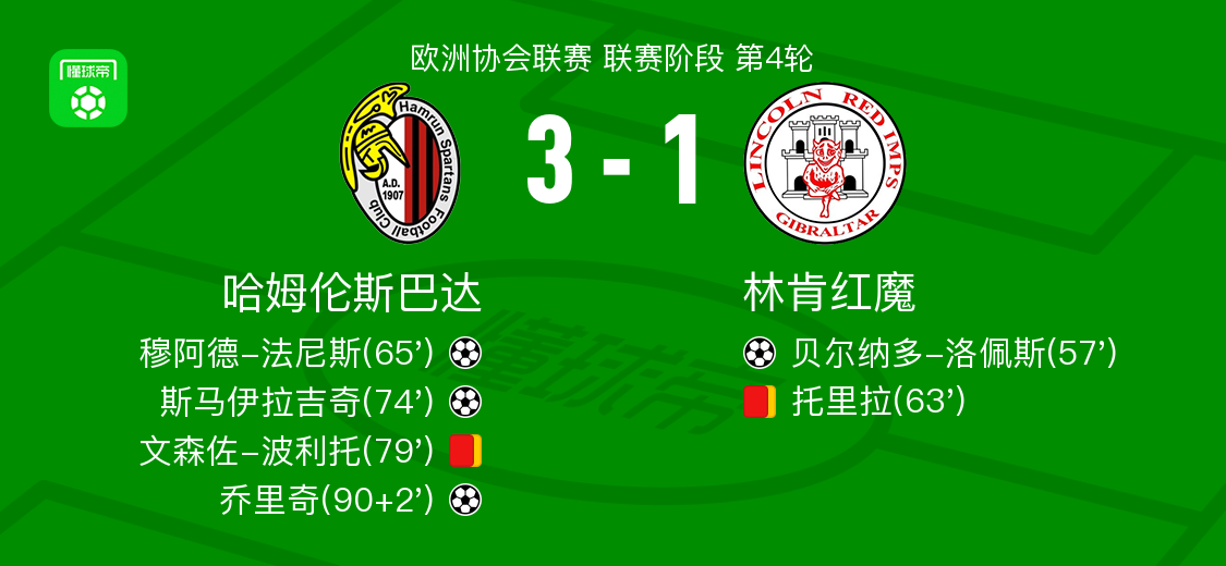 北京时间11月28日,欧洲协会联赛联赛阶段第4轮展开较量,哈姆伦斯巴达迎战林肯红魔。比赛中,林肯红魔率先取得进球,贝尔纳多-洛佩斯接德巴尔助攻破门得分。随后哈姆伦斯巴达展开反击,穆阿德-法尼斯在菲利普-科菲的助攻下完成破门。紧接着,斯马伊拉吉奇接拉斐尔-康普里的传球再下一城,帮助球队反超比分。比赛后段,文森佐-波利托累计两张黄牌被罚离场。临近结束前,卡杰诺维奇送出助攻,乔里奇推射得手,进一步扩大领先优势。最终全场比赛结束,哈姆伦斯巴达以3比1战胜林肯红魔。