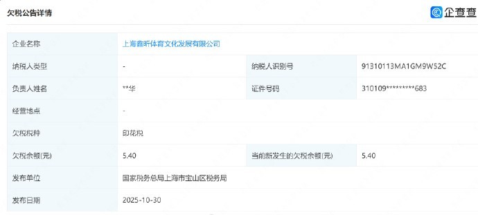 值得一提的是,近期许昕担任董事并持股23%的上海鑫昕体育文化发展有限公司因欠税5.4元被国家税务总局上海市宝山区税务局公告。