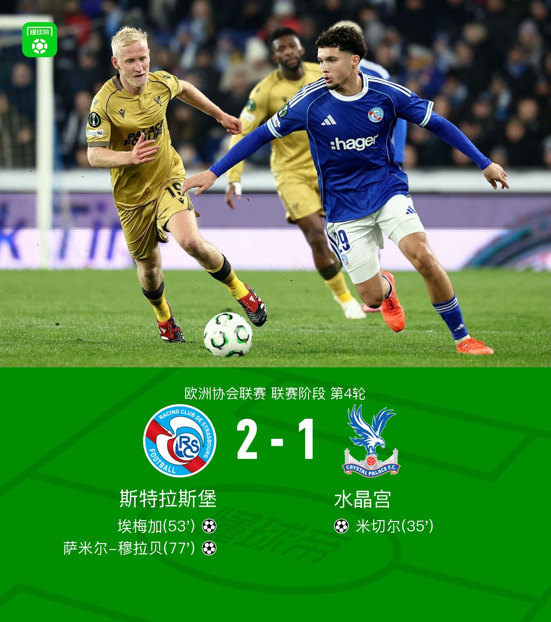 第53分钟,埃梅加禁区后点垫射破门,斯特拉斯堡1-1水晶宫