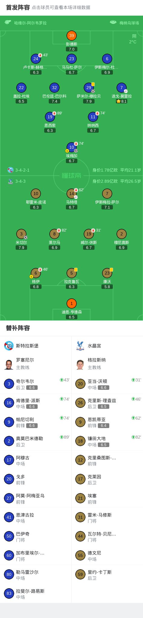 第35分钟,米切尔禁区左路低射破门,水晶宫1-0斯特拉斯堡