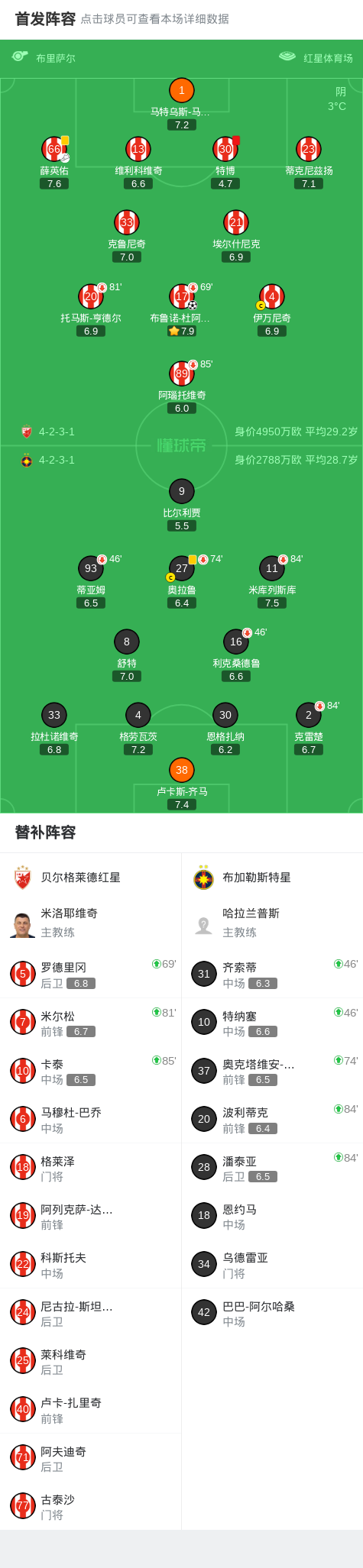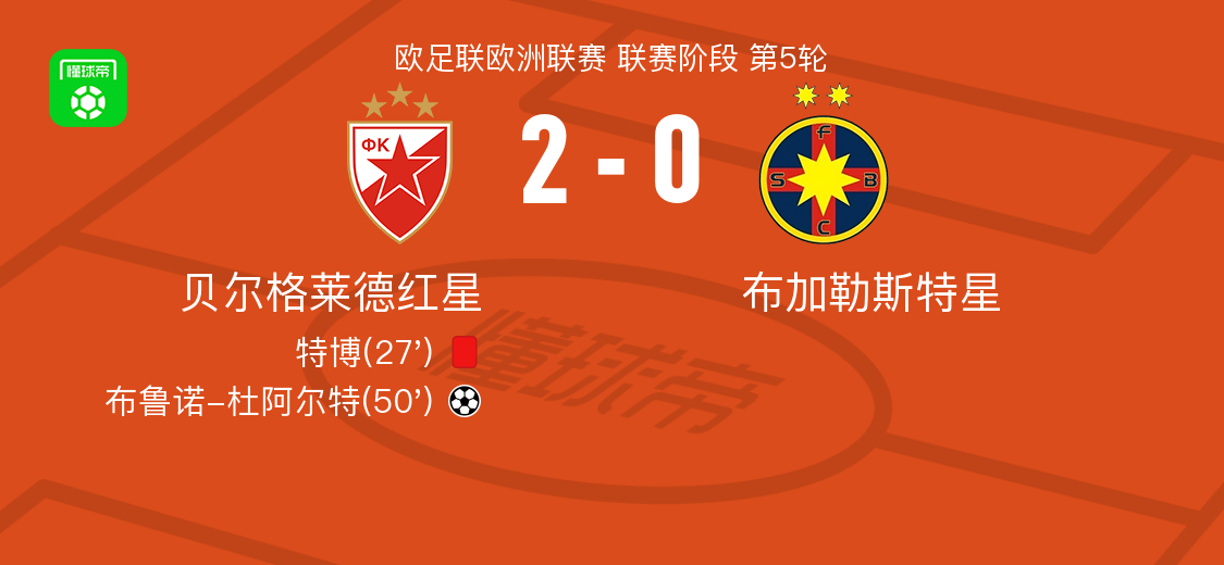 北京时间11月28日欧足联欧洲联赛 联赛阶段 第5轮,贝尔格莱德红星对阵布加勒斯特星。贝尔格莱德红星布鲁诺-杜阿尔特破门。最终比分贝尔格莱德红星 20 布加勒斯特星。