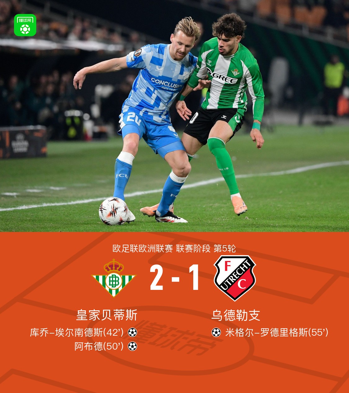 北京时间11月28日,欧足联欧洲联赛联赛阶段第5轮展开较量,皇家贝蒂斯与乌德勒支狭路相逢。比赛中,皇家贝蒂斯率先打破僵局,安东尼送出助攻,库乔-埃尔南德斯完成破门。易边再战,福尔纳尔斯成功策动进攻,阿布德接应得分,帮助球队扩大领先优势。随后乌德勒支展开反击,阿莱助攻米格尔-罗德里格斯破门,为球队扳回一城。此后双方均未能改写比分,最终全场结束,皇家贝蒂斯以2比1战胜乌德勒支。
