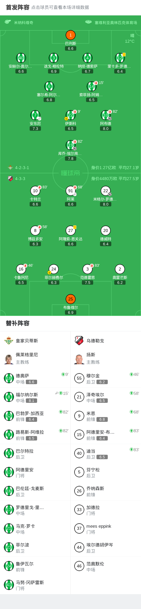 第42分钟,安东尼助攻库乔-埃尔南德斯头球破门,贝蒂斯1-0