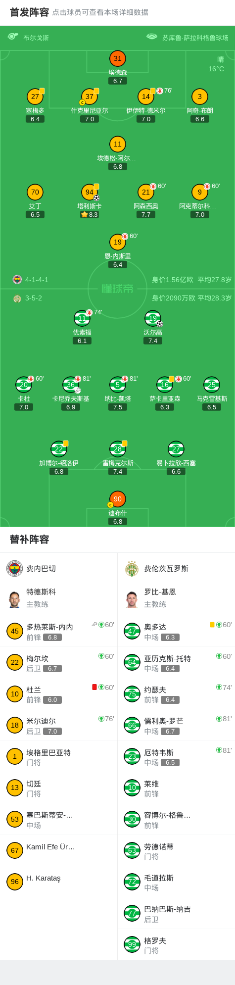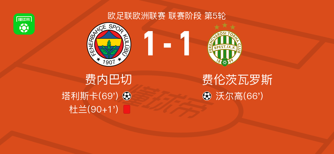北京时间11月28日,欧足联欧洲联赛联赛阶段第5轮,费内巴切对阵费伦茨瓦罗斯。比赛中,费伦茨瓦罗斯由卡尼乔夫斯基送出助攻,沃尔高破门得分。随后,多热莱斯-内内助攻塔利斯卡完成进球,帮助费内巴切扳平比分。下半场补时阶段,杜兰被红牌罚下。最终双方以1比1握手言和。