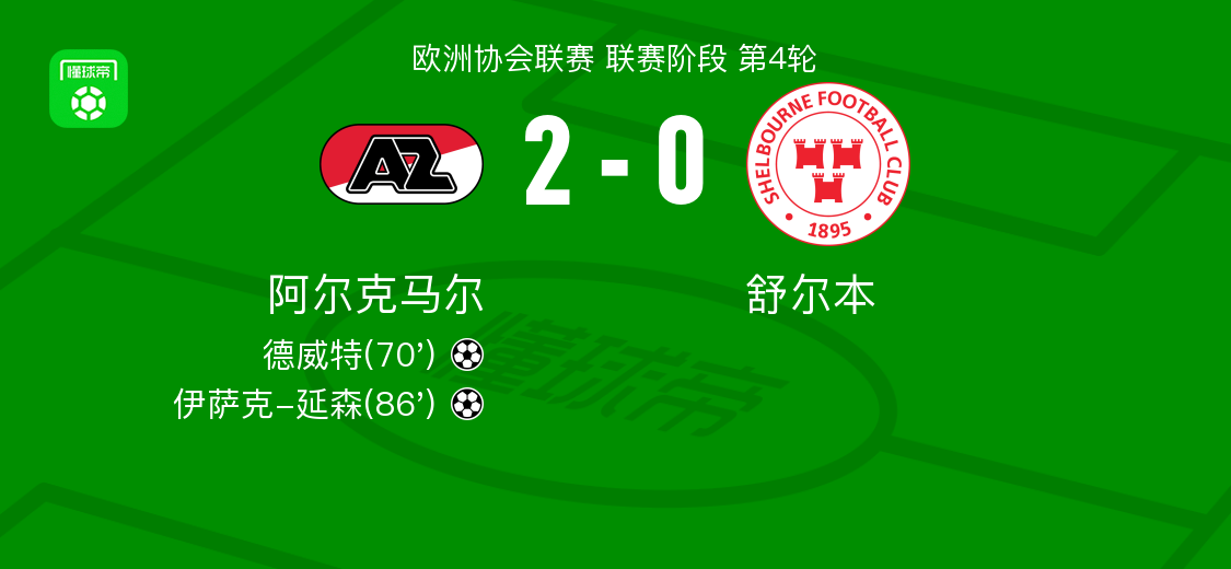 北京时间11月28日,欧洲协会联赛联赛阶段第4轮展开较量,阿尔克马尔迎战舒尔本。比赛中,科普梅内尔斯送出助攻,德威特接球后完成破门,为球队取得领先。随后,伊萨克-延森再下一城,将比分进一步扩大。全场比赛结束,阿尔克马尔以2-0战胜对手。