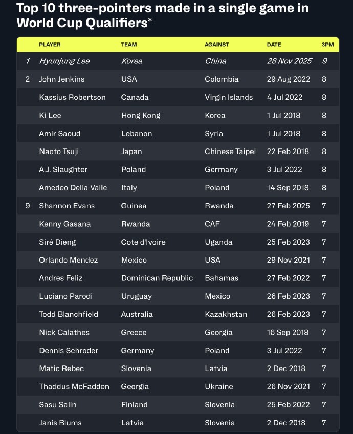 本场比赛,韩国球星李贤重发挥出色,尤其是他命中了9记三分。据FIBA官方统计,李贤重创下了FIBA自2017年实施新的世预赛制度后的个人单场三分命中数纪录。此前的纪录为8记三分。