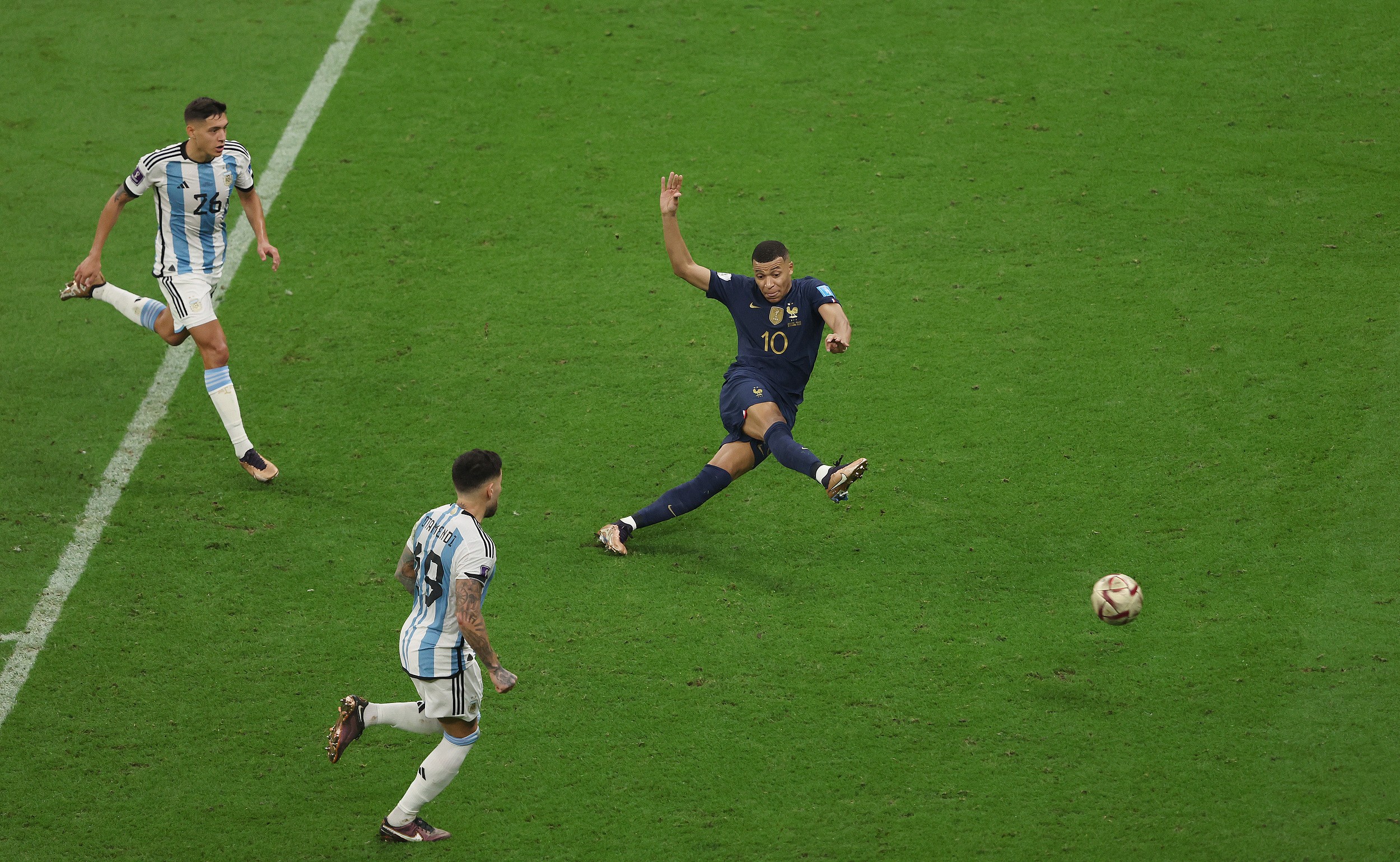 2022年12月18日,世界杯决赛,法国半场0-2落后阿根廷。第80分钟,姆巴佩点球扳回一城。97秒后,姆巴佩与小图拉姆打出配合,随后高难度凌空卧射破门,为法国队扳平了比分!